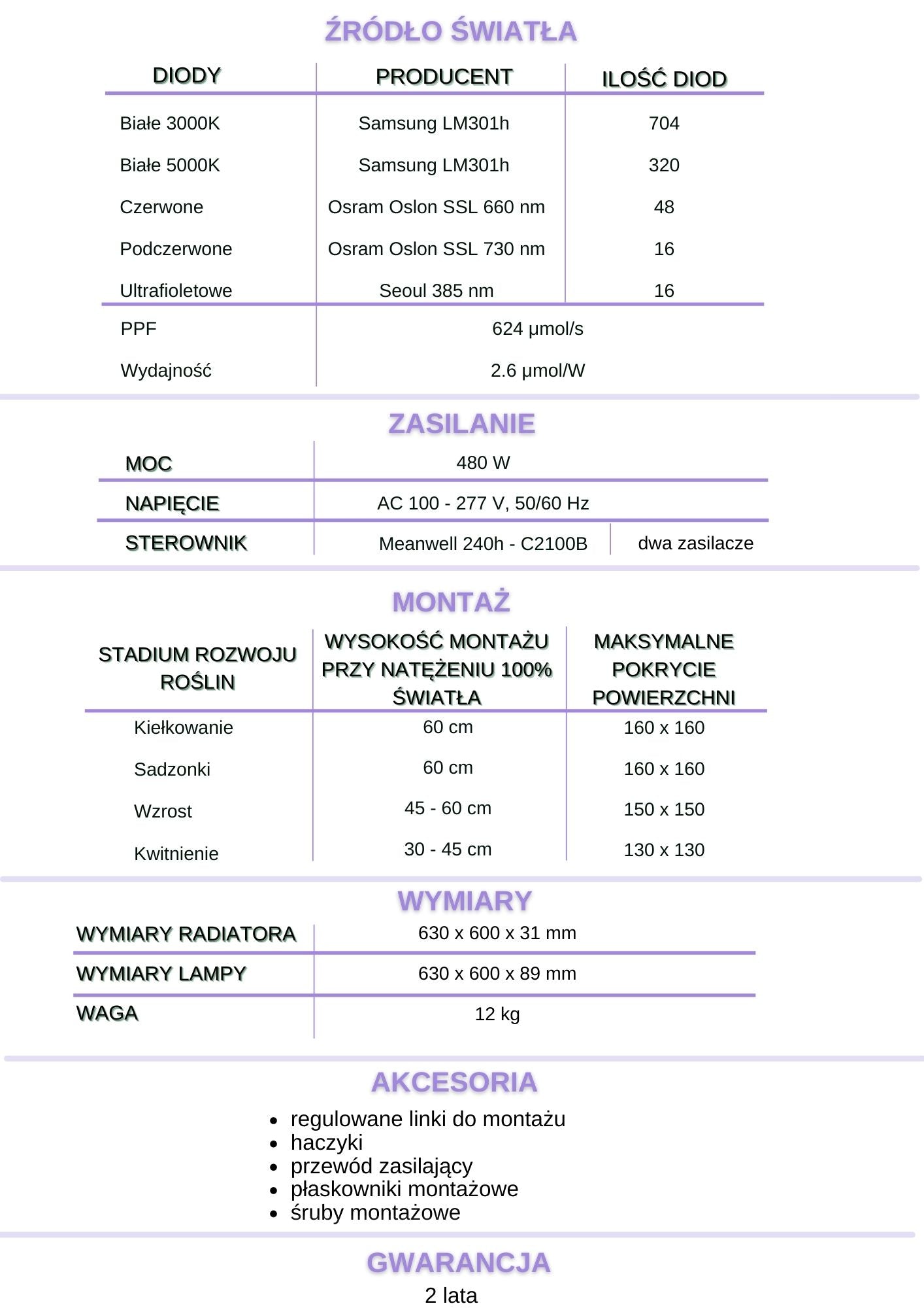 - Samsung LM301H 3000K i 5000K – najwyższej klasy białe diody zapewniające optymalne spektrum i wydajność.